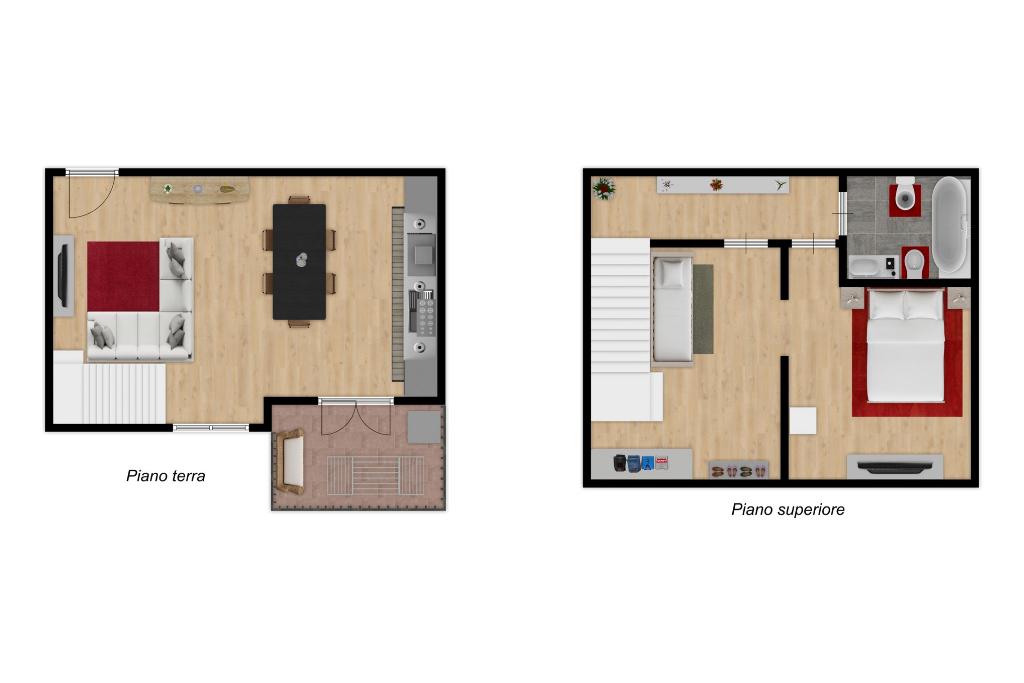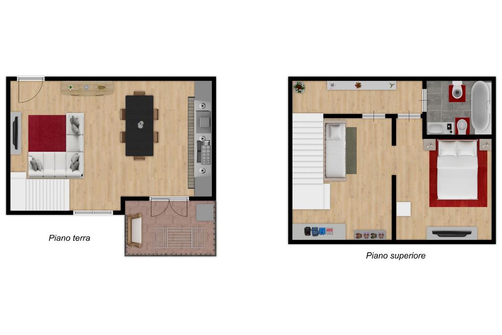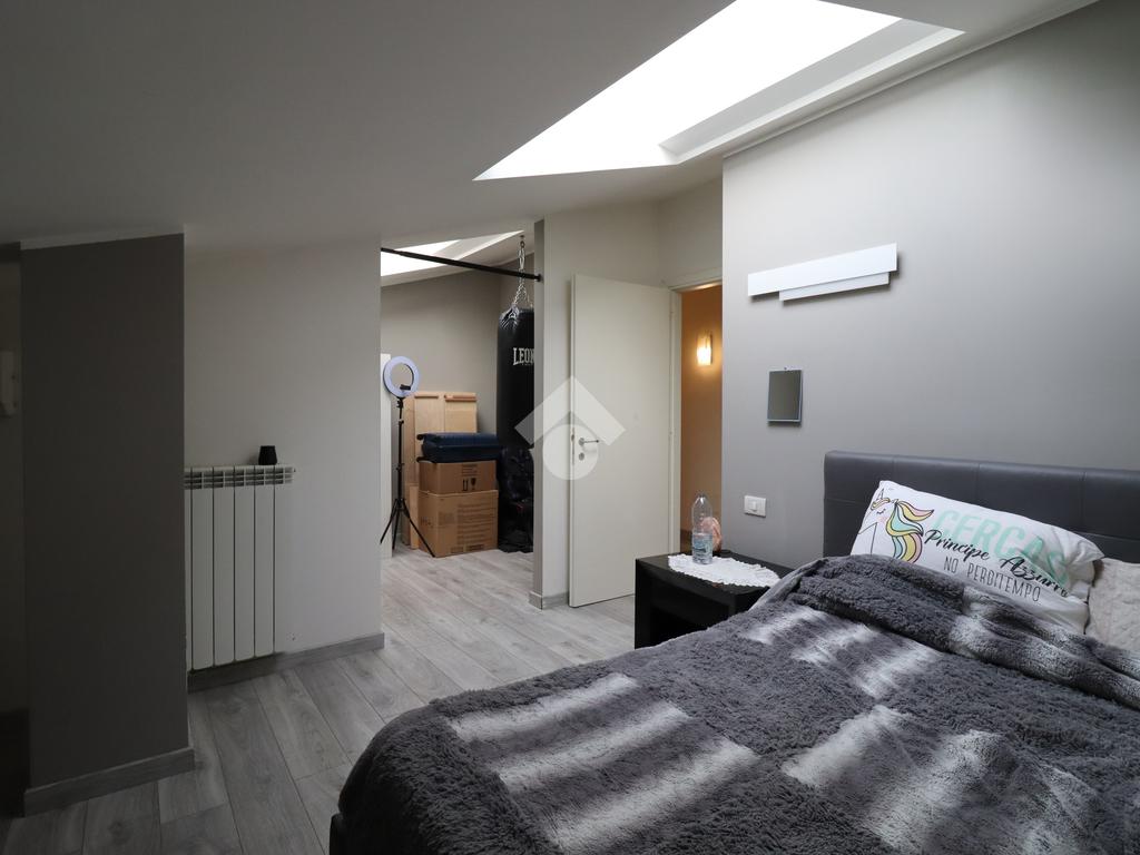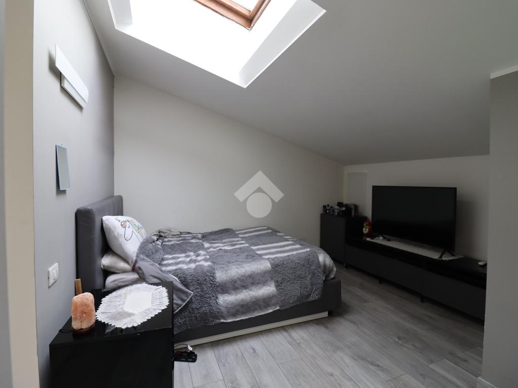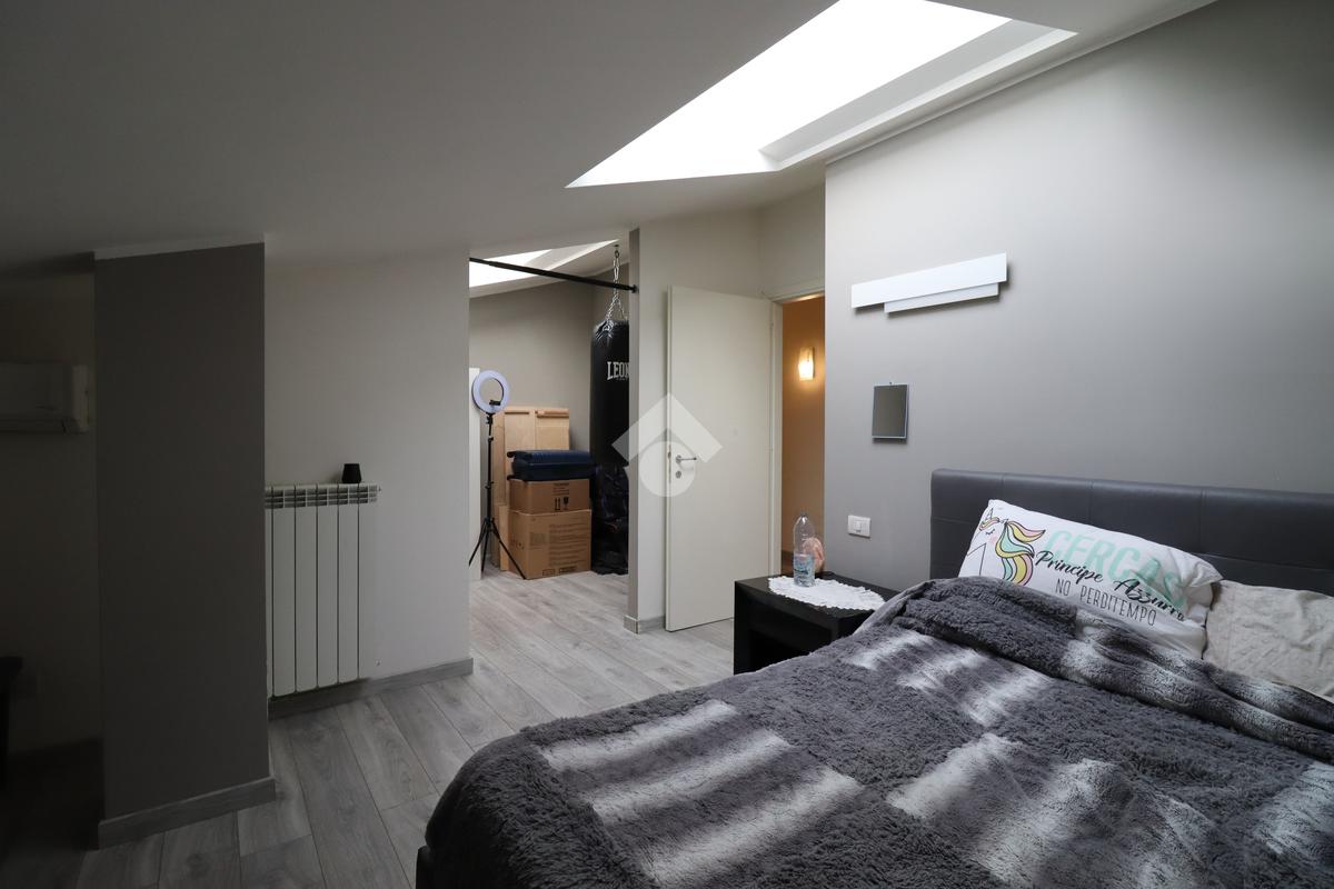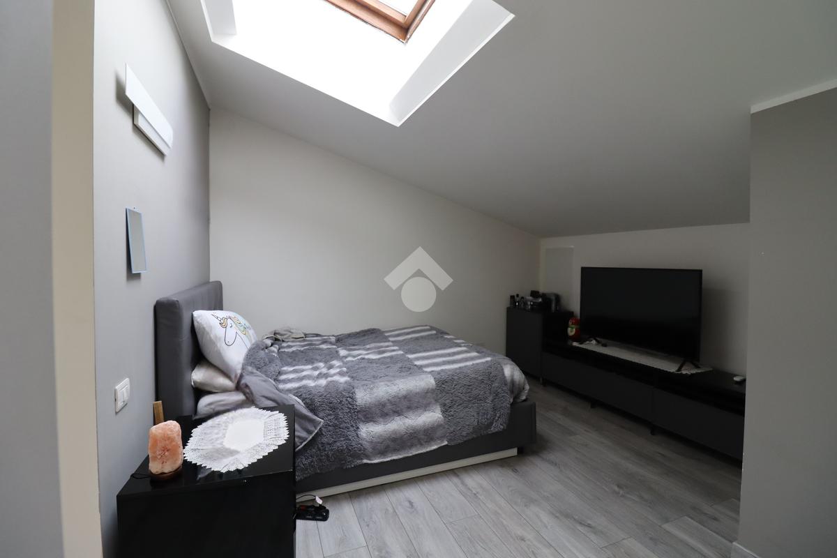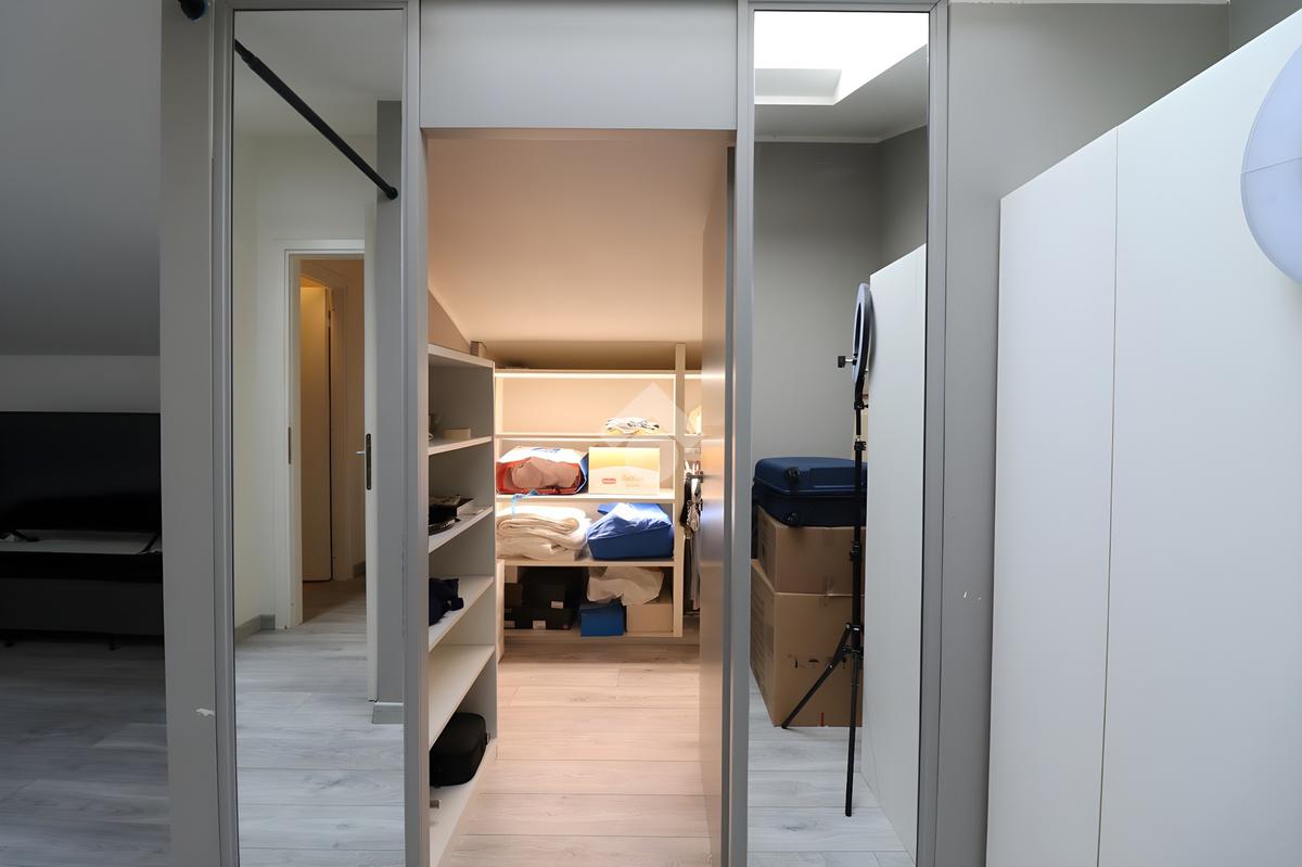 Attraverso le scale interne si accede al piano superiore dedicato alla zona notte. Questo livello è composto da una spaziosa camera matrimoniale, caratterizzata dalla presenza di un lucernario che assicura una splendida illuminazione naturale, e di una seconda camera interamente adibita a cabina armadio, pensata per una gestione ottimale degli spazi. Il piano è completato dal bagno padronale dotato di vasca.