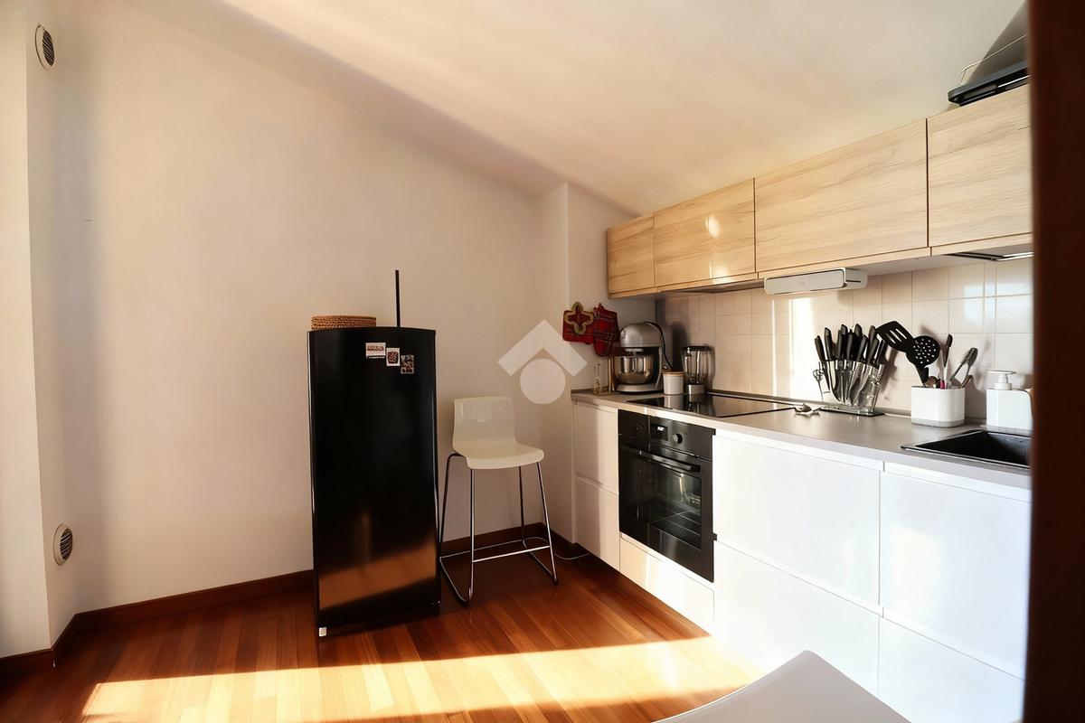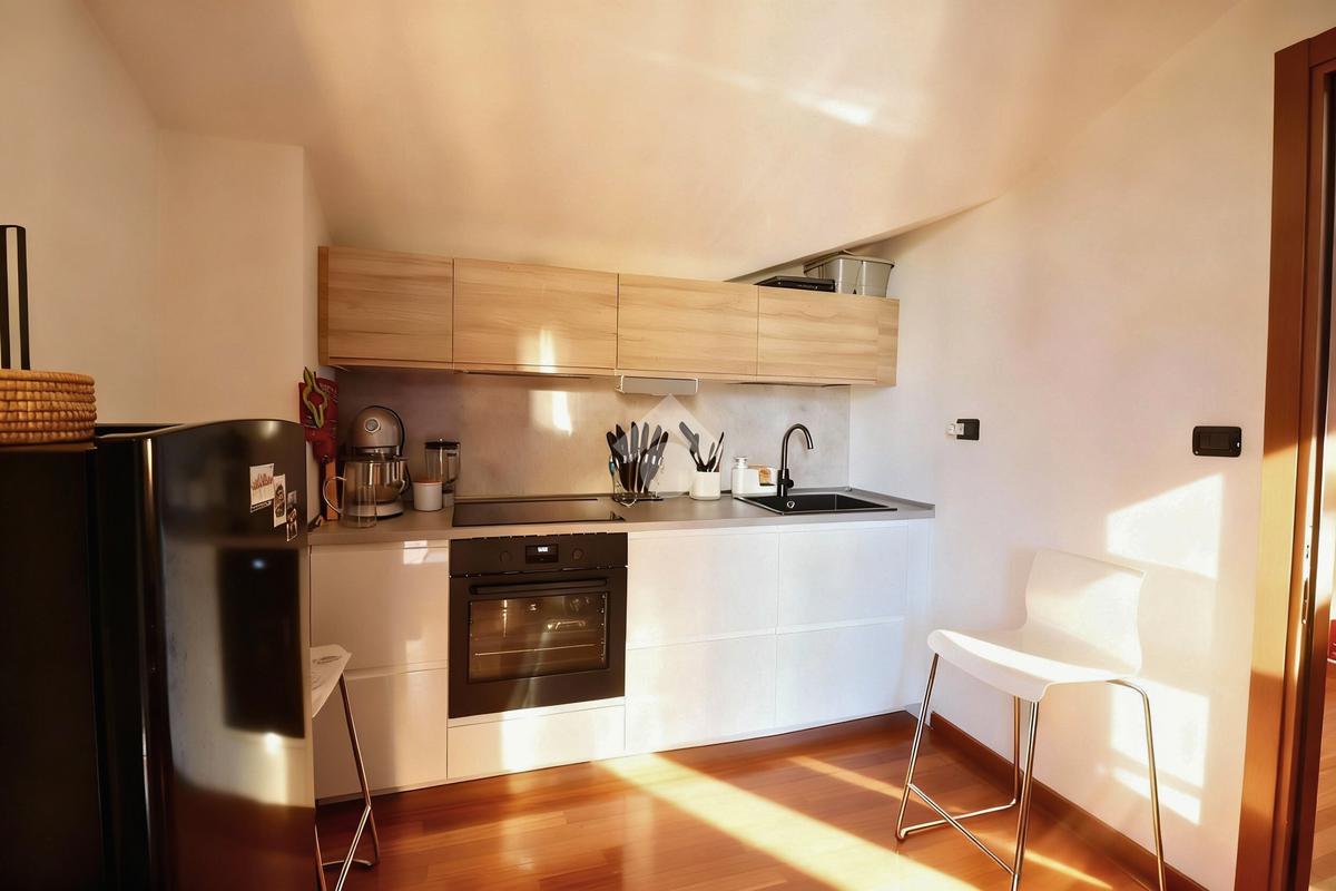 La cucina separata e funzionale dispone anch’essa di accesso diretto al terrazzo, rendendo la zona giorno pratica e ben distribuita.