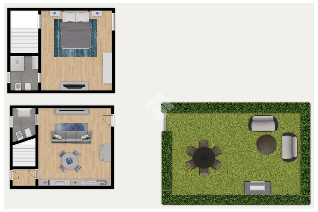 La distribuzione interna prevede una camera da letto e due bagni, organizzati su due livelli che consentono una netta separazione tra zona giorno e zona notte, offrendo ambienti confortevoli e ben organizzati.