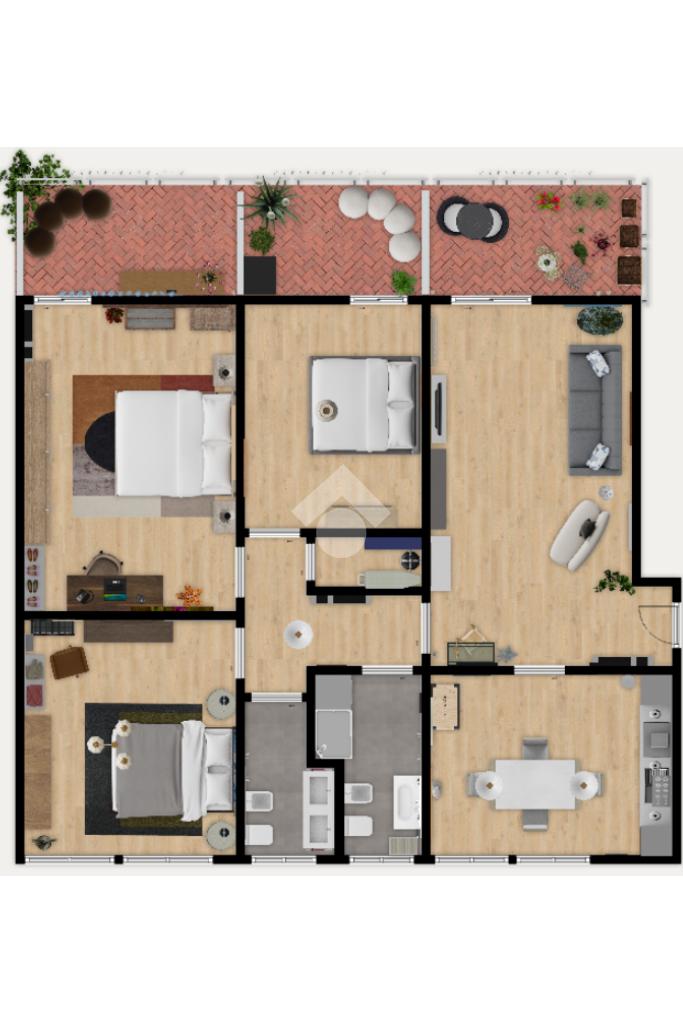 La zona notte è ben separata e offre tre camere da letto di dimensioni molto comode, un elemento ormai raro nelle abitazioni più recenti. La camera matrimoniale principale dispone dell’accesso diretto al terrazzo, mentre la cameretta gode anch’essa dell’uscita sul terrazzo.