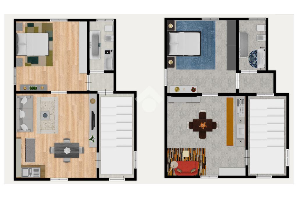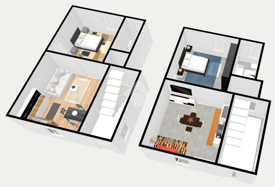 Salendo al piano superiore si sviluppa il secondo appartamento, anch’esso composto da camera matrimoniale, bagno con vasca e una comoda zona giorno con cucina e sala, con ambienti ben distribuiti e funzionali.